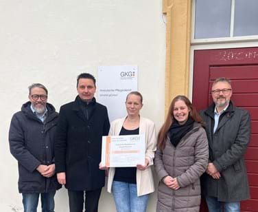 Von links: Geschäftsführer der GKG Bamberg Udo Kunzmann, 1. Bürgermeister der Stadt Baunach Tobias Roppelt, Pflegedienstleitung Ambulanter Pflegedienst Baunach Stefanie Josuks, Einrichtungsleitung Ambulanter Pflegedienst Baunach Alexandra Schlicht, stellvertretender Geschäftsführer der GKG Bamberg Harald Poßer