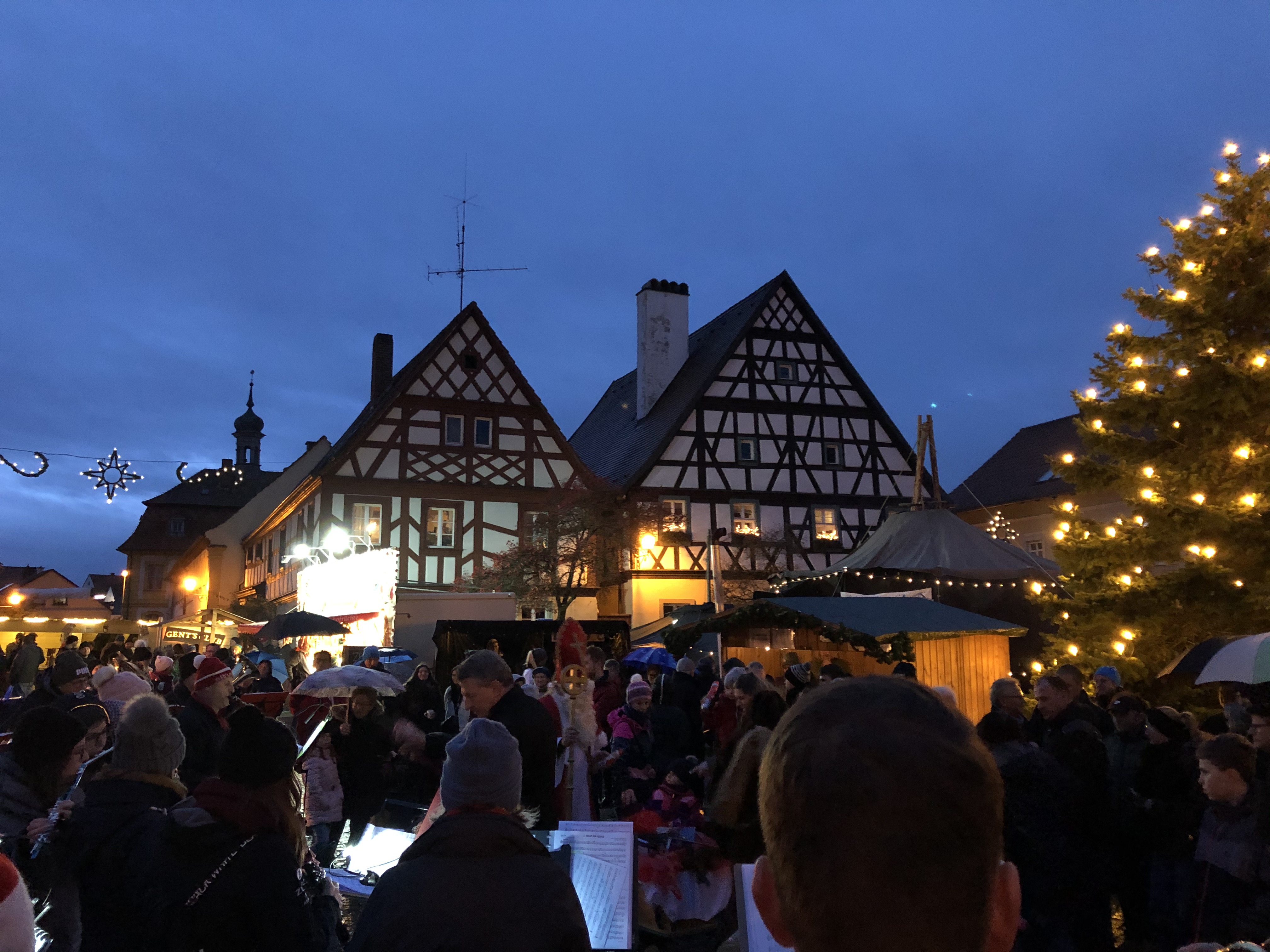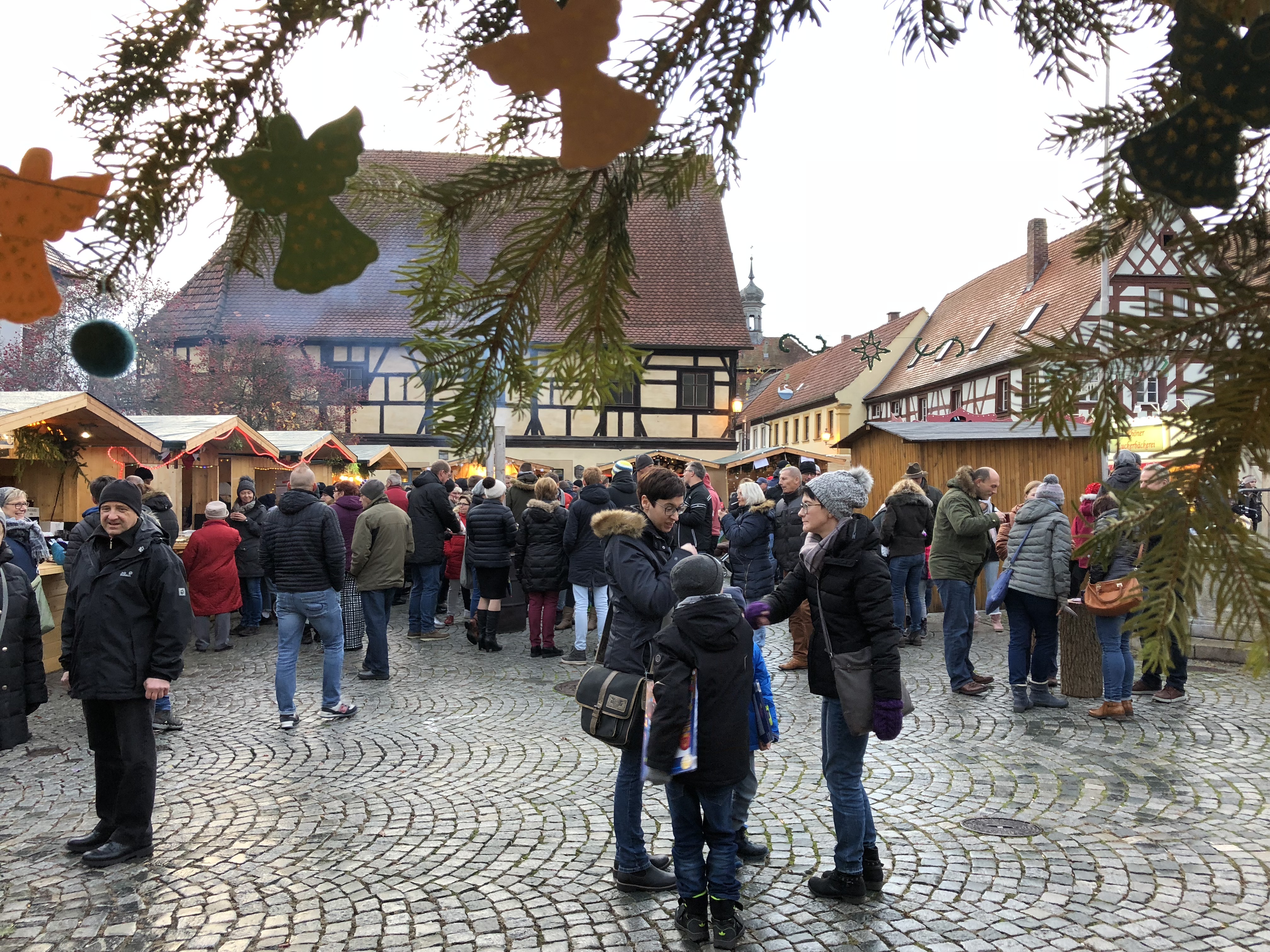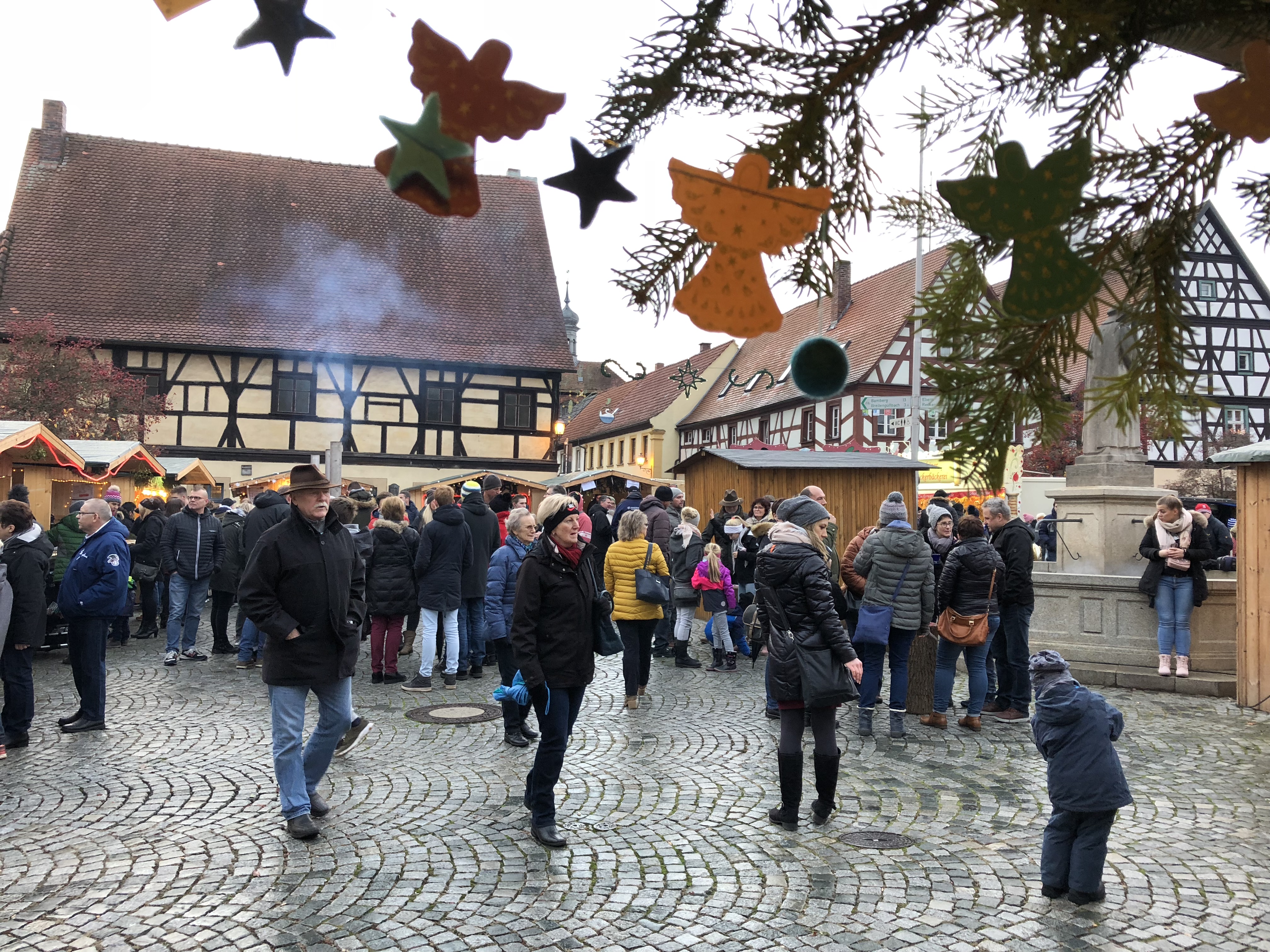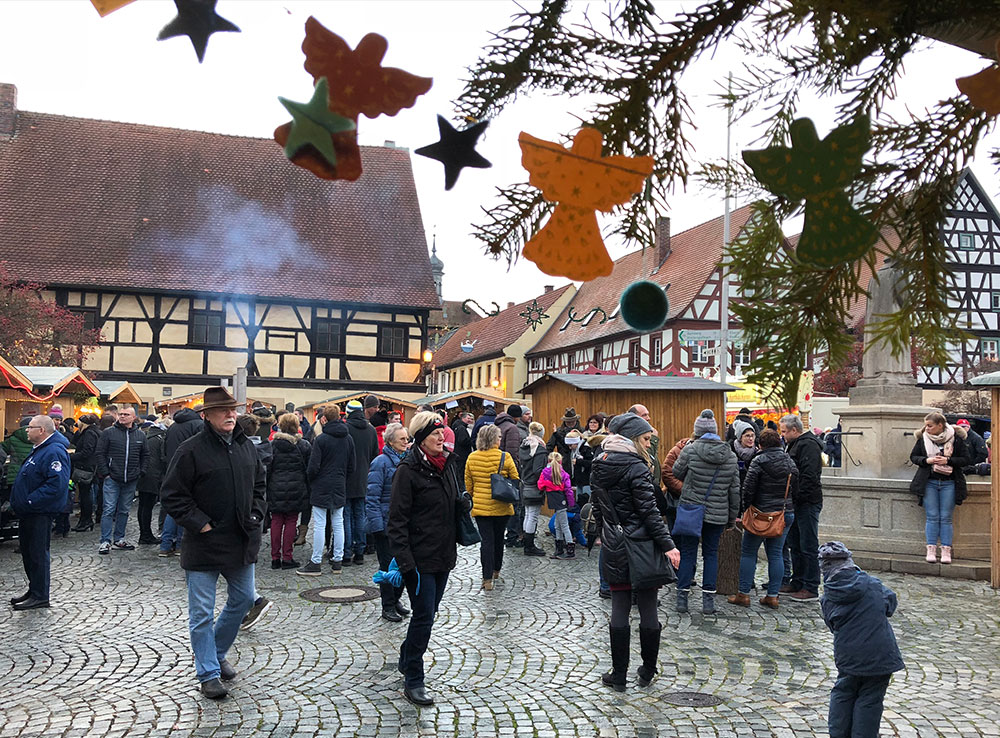 Auch am 2. Adventssonntag werden die Feuertöpfe und Lichterketten wieder entfacht. Nicht nur rund um den Marktplatz sorgen dann Verkaufsbuden für eine stimmungsvolle Atmosphäre vor historischer Kulisse – auch entlang der Überkumstraße bis zum Bürgerhaus Lechner Bräu präsentieren Kunsthandwerker weihnachtliches und viele andere festliche Dekorations- und Geschenkideen. Genießen Sie beim Bummeln Bratwürste, Waffeln, Glühwein und vieles mehr von einem der traditionellen Ständen. Im Bürgerhaus findet ebenfalls ein Kunsthandwerkermarkt statt – bei diesem großen Angebot wird sicher jeder fündig! Die Stadtbücherei bietet einen großen Bücherflohmarkt zum Stöbern an. Für stimmungsvolle Musik sorgen an diesem Tag die Sendelbachtaler Musikanten und die Stadtkapelle Baunach.